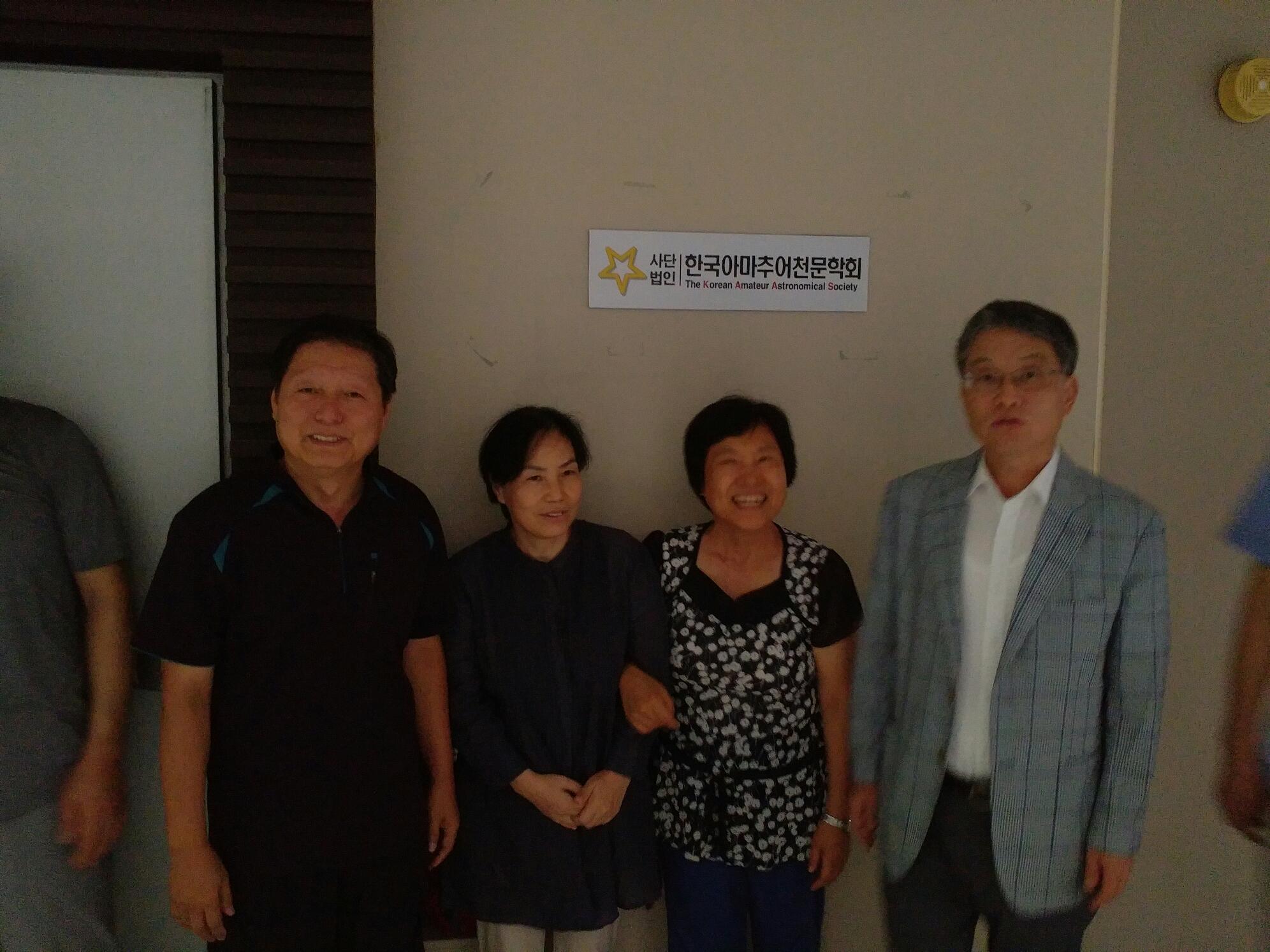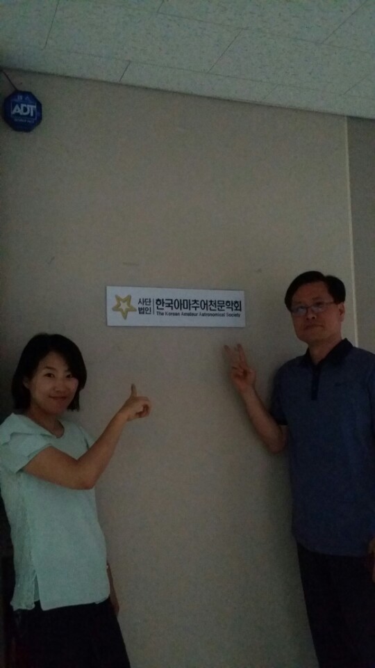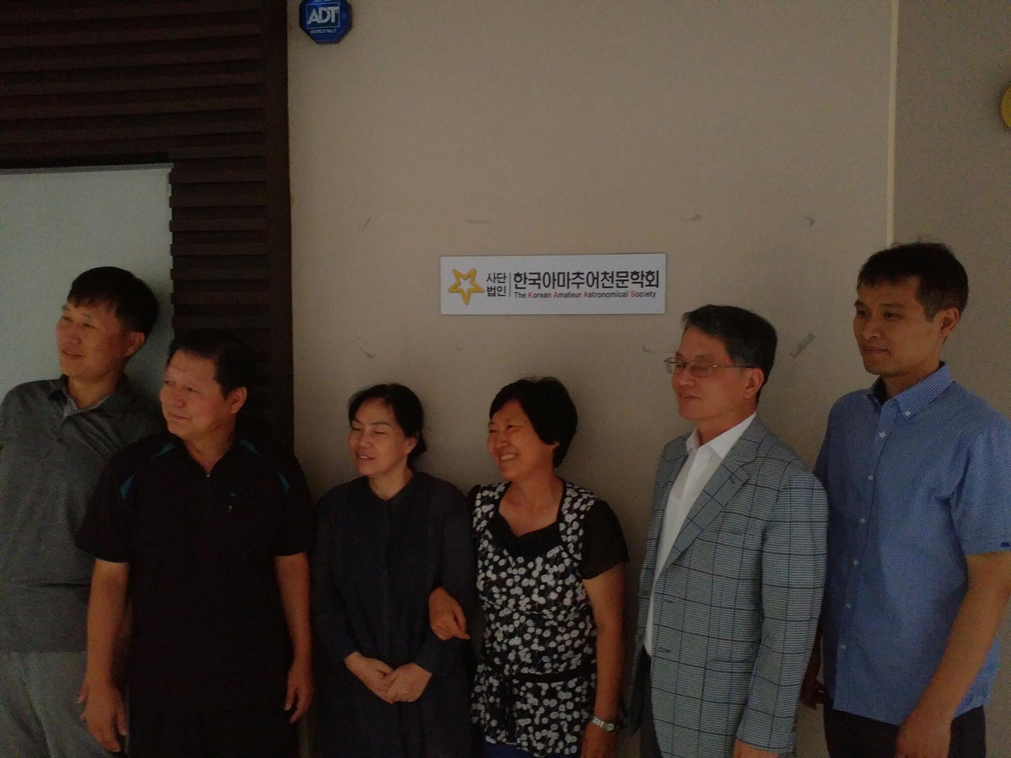 먼저 도착하신 정해수님이 들고 오신 학회 현판을 전승숙님이 꼼꼼하게 닦아 출입문과 복도에 붙였습니다. 복도 현판 앞에서 기념촬영을 시작으로 학회 사무실 이전에 대한 경과보고가 있었습니다. 이번 사무실 이전에 물심양면으로 공이 큰 김민회국장님이 본인의 노고를 말하기 민망스러우신지 애꿎은 천체관측대회만 이야기 하시고 이어서 회장님의 기념사가 있었습니다. 지난 2년여 회장님 그늘아래 용산 사무실에서 서울살림살이를 시작하여 학회가 자립의 기초를 다지고 내부적인 체계를 잡아 이제 스스로 내딛는 첫걸음을 축하해주시며 회원들의 봉사와 임원진들의 노고로 현재의 학회가 있었음을 치하하셨습니다. 관리실장님이 준비하신 샴페인과 치즈케익을 나누며 대한민국을 대표하는 천문학회로 자리매김 하여 더욱 번창하기를 기원하는 이수웅감사님의 건배사를 끝으로 조촐한 개소식을 마무리 지었습니다.