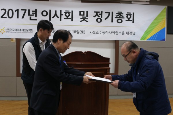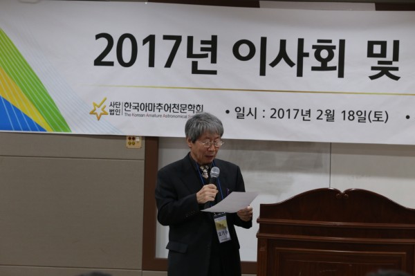 아마추어천문학을 제대로 이해도 못한채 회장이라는 자리에 올라 3년 동안 마음 고생이 심했습니다. 그래도 부회장님들을 비롯한 학회임원들과 지부장님들. 그리고 사무처장님을 비롯한 사무처간부님들의 도움으로 무난히 임기를 마치고 이 자리에 서있는 것을 큰 행운이라고 생각합니다.