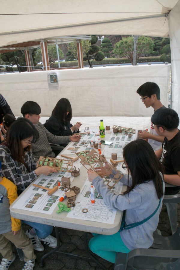 나무망치와 본드를 갖고, 설명서를 보면서 집중하고 있는 체험자들 모습입니다.