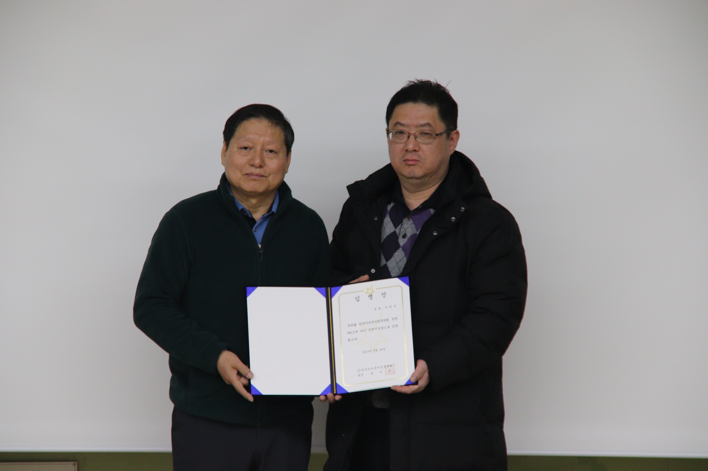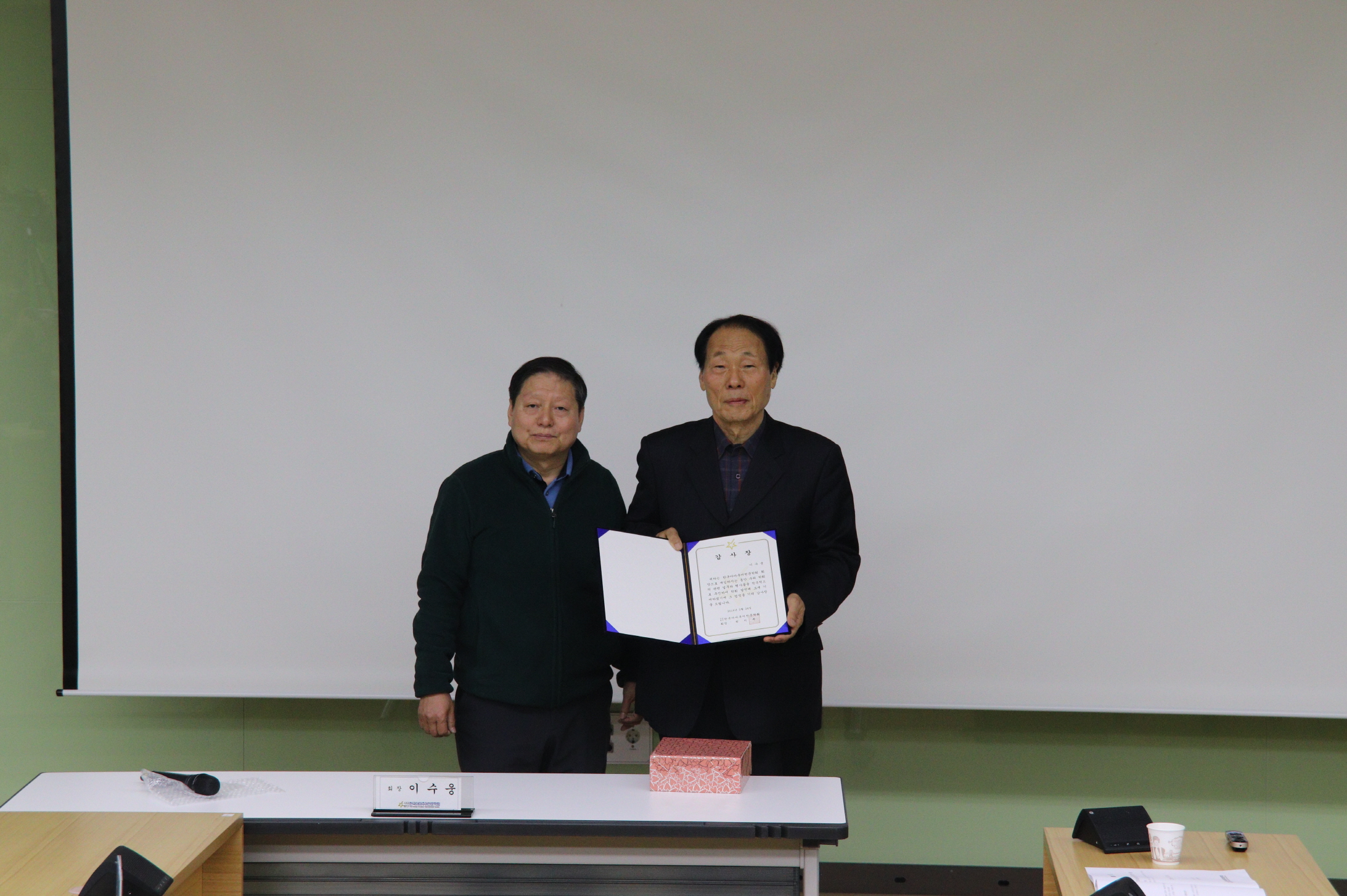 좌측 원치복 학회장님께서 우측 이수웅 前 학회장님께 감사패를 전달하는 모습