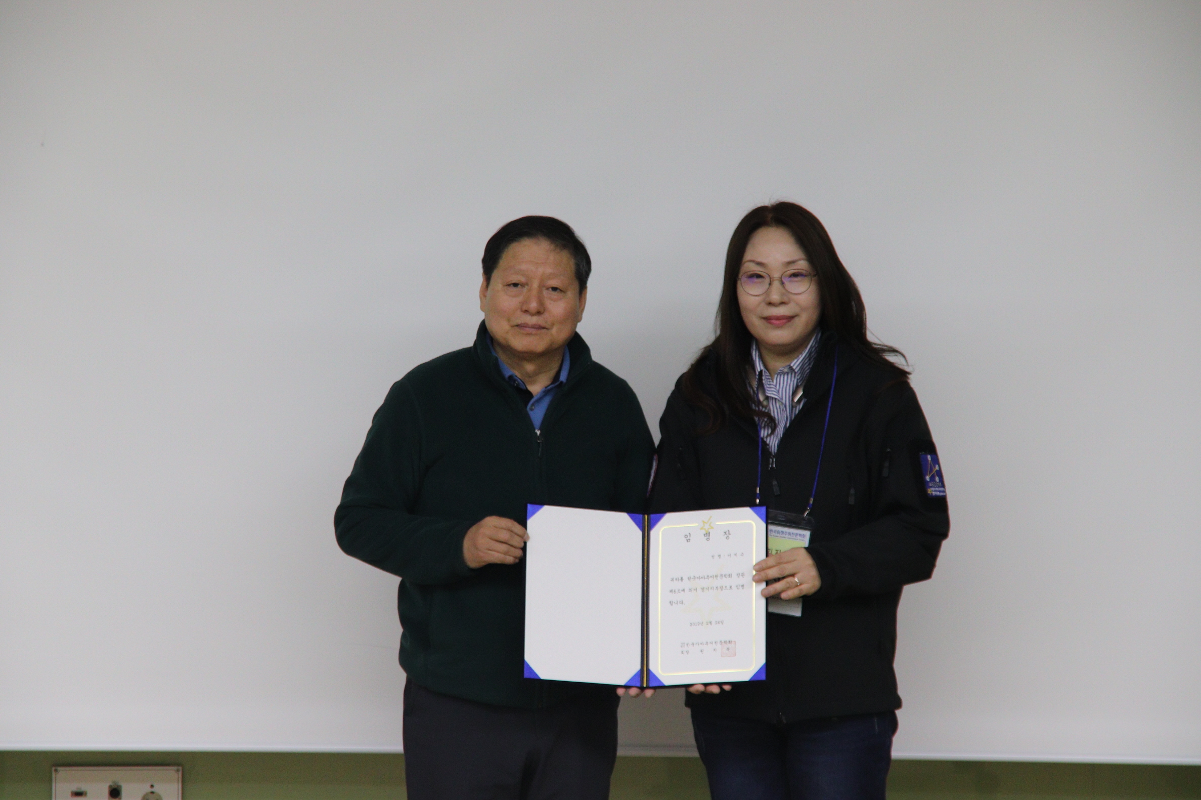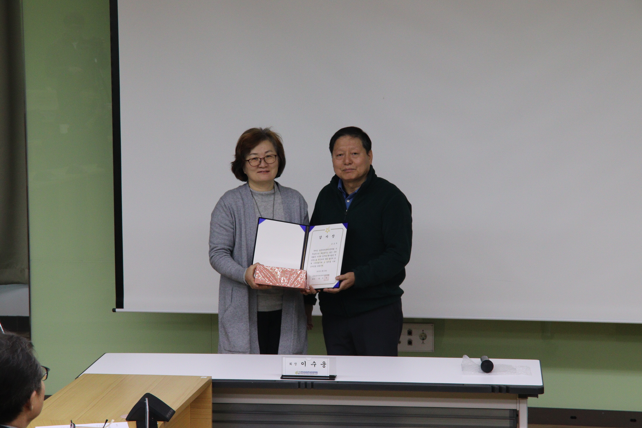 우측 원치복 학회장님께서 좌측 손은주 前 관리실장님게 감사패를 전달하는 모습
