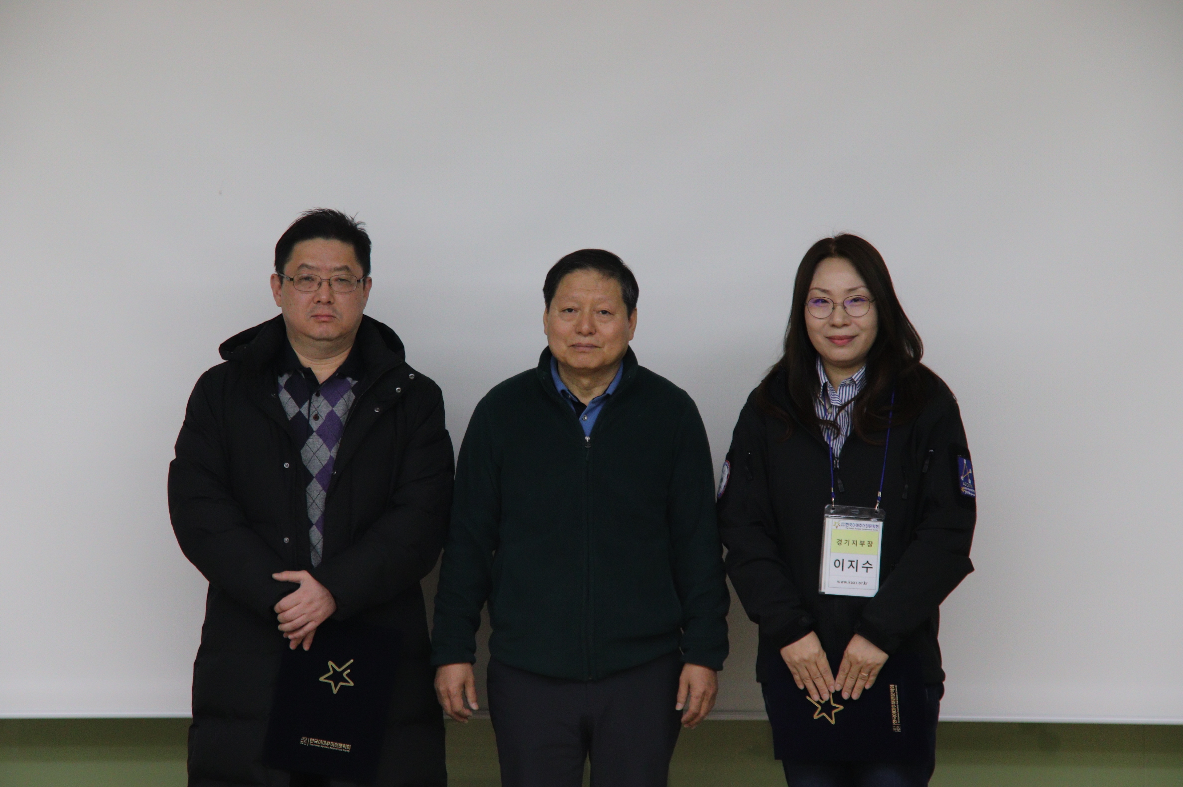 좌 인천지부 이창우 지부장님 가운데 원치복 학회장님 우 경기지부 이지수 지부장님