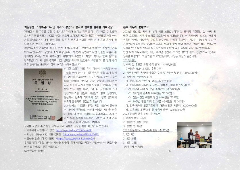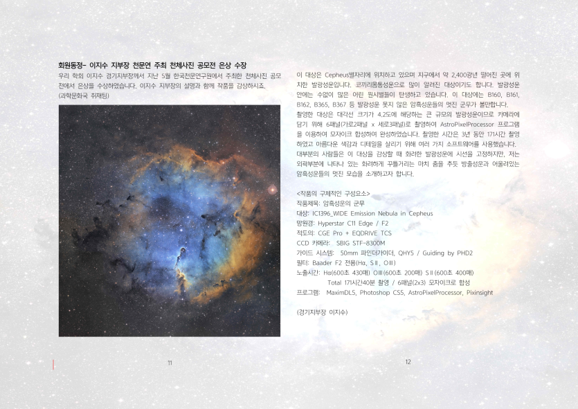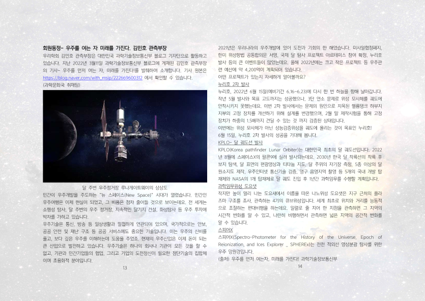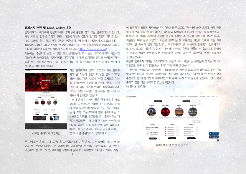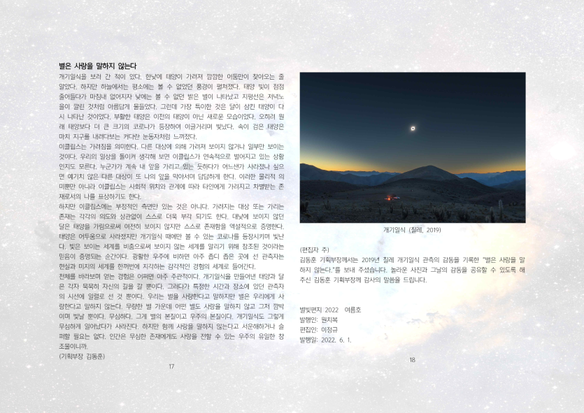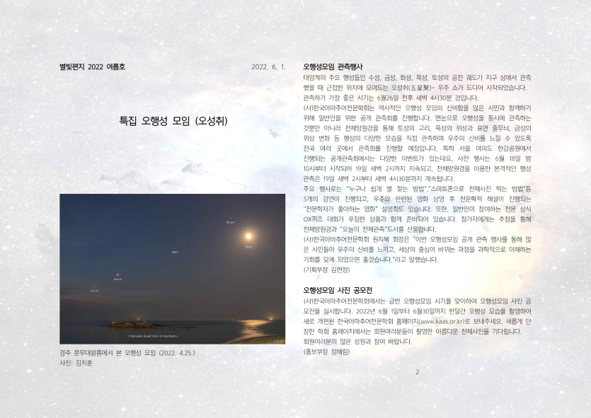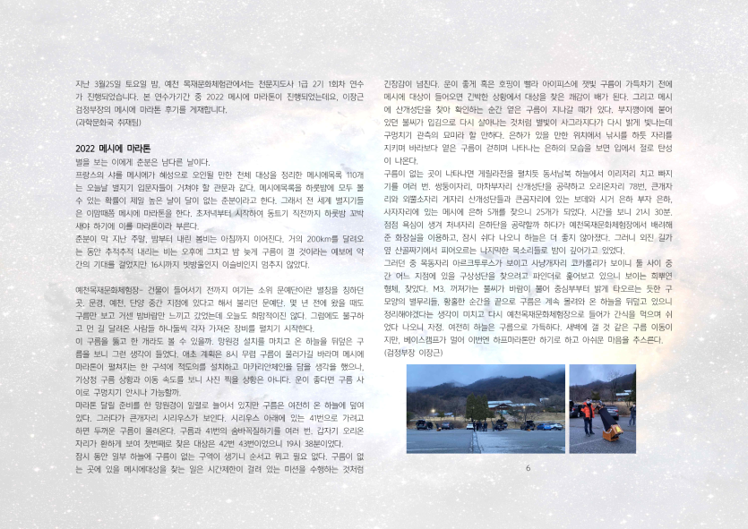 별빛편지 2022 여름호 발간 페이지 정보 작성자 이정규 쪽지보내기 메일보내기 자기소개 아이디로 검색 전체게시물 쪽지보내기 메일보내기 자기소개 아이디로 검색 전체게시물 댓글 1건 조회 5,365회 작성일 22-06-02 08:41 본문 추천2 페이스북 공유 트위터 공유 구글+ 공유 첨부파일 별빛편지2022여름호220601.pdf (5.2M) 46회 다운로드 | DATE : 2022-06-02 09:23:00 목록 이전글 [7/5 공모 마감]오행성모임 사진 공모전 실시 다음글 [11월 13일 종료]홈페이지 개편 오픈 깜짝 이벤트! (로그인 필수) - 참여에 감사드립니다. 본 이벤트는 11월 13일 종료되었습니다. 댓글목록 댓글목록 arstar님의 댓글 arstar 이름으로 검색 이름으로 검색 작성일 22-06-03 10:07 내용이 많이 알찹니다 고생하셨습니다! 답변 삭제 내용이 많이 알찹니다 고생하셨습니다!