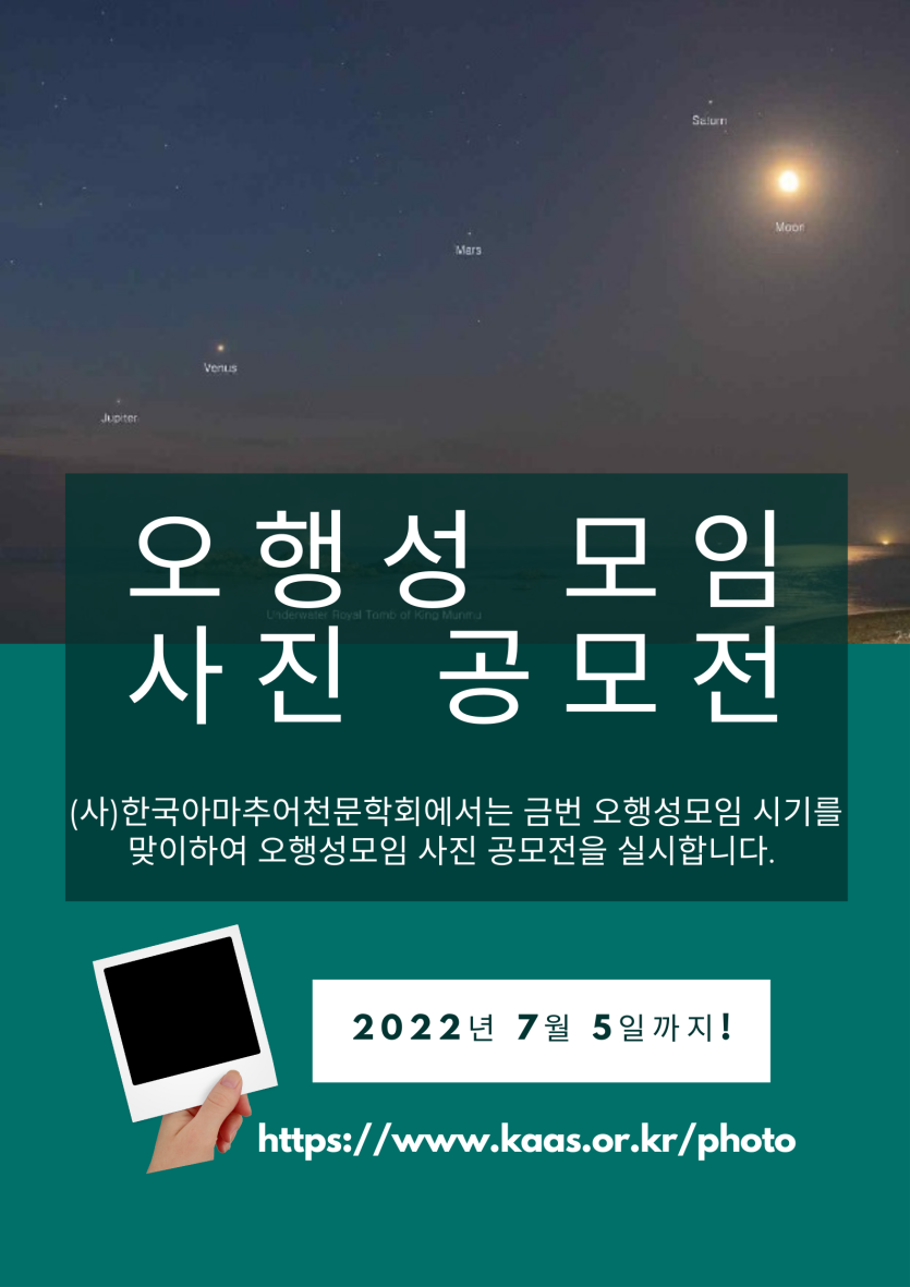 2022년 6월 1일부터 7월 5일까지 오행성 모습을 촬영하여 새로 개편된 한국아마추어천문학회 홈페이지 > 참여마당 > 천체사진 https://www.kaas.or.kr/photo에 올려주세요.