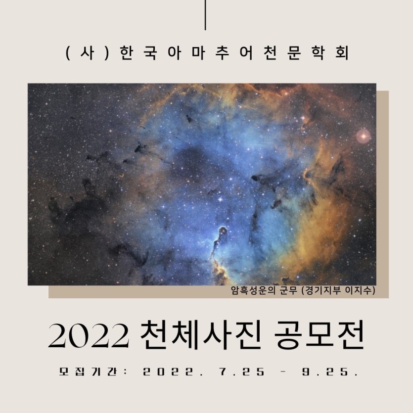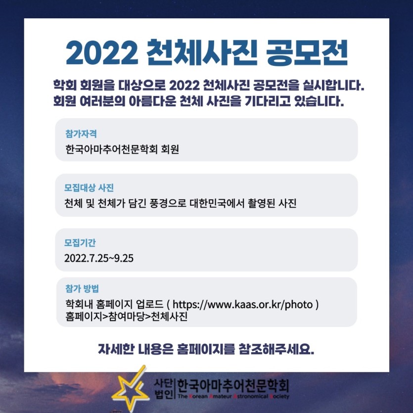 한국아마추어천문학회에서는 학회 회원을 대상으로 2022 천체사진 공모전을 아래와 같이 실시합니다. 학회 회원 여러분의 많은 참여를 바랍니다.