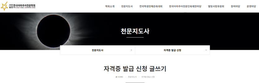 합격자 발표를 확인하신 연수생은 2급 천문지도사 자격증을 신청해 주세요.