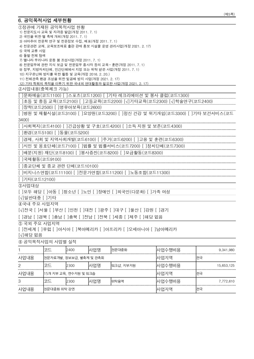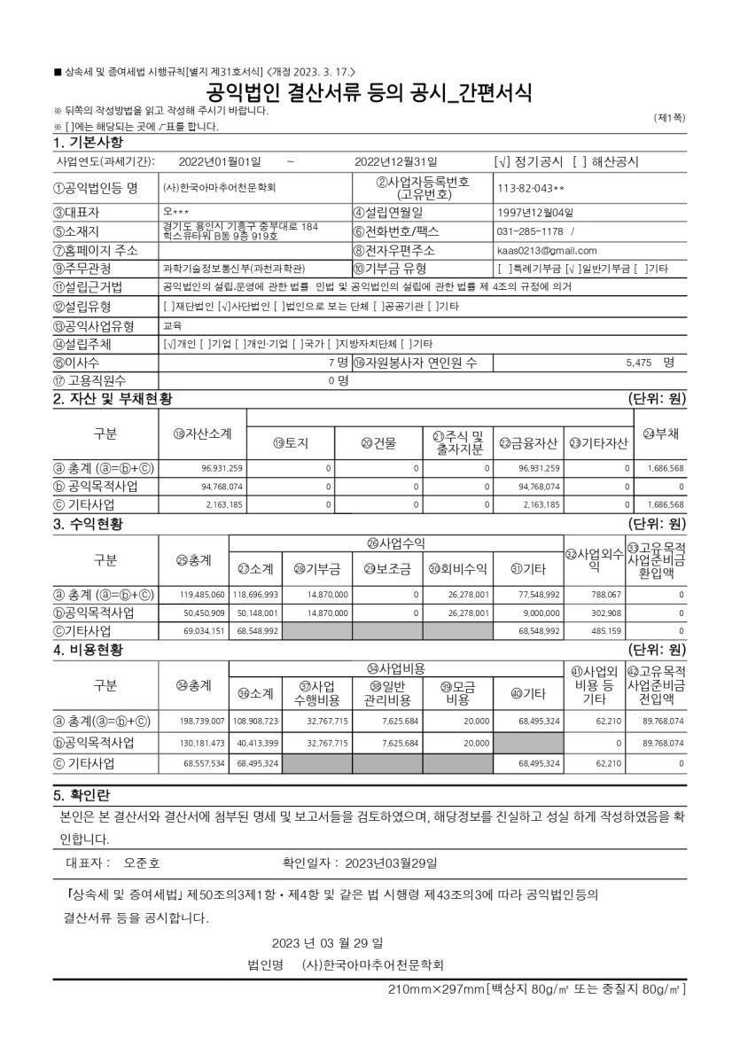 공익법인 2022년 결산서류 등의 공시_간편서식 페이지 정보 작성자 관리자 쪽지보내기 메일보내기 자기소개 아이디로 검색 전체게시물 쪽지보내기 메일보내기 자기소개 아이디로 검색 전체게시물 댓글 0건 조회 5,130회 작성일 23-03-29 14:50 본문 (사)한국아마추어천문학회에서는 2022년 사업년도에 대한 공익법인 결산서류를 다음과 같이 공시합니다. (파일첨부)본 공시서류는 국세청 홈택스에서도 조회 가능함을 안내드립니다. (천문지도사 사업은 수익사업으로 기타사업 항목으로 구분) 추천0 페이스북 공유 트위터 공유 구글+ 공유 첨부파일 한아천-사업년도2022공시 보고서_의무공시 기본사항 외.pdf (197.1K) 37회 다운로드 | DATE : 2023-03-29 14:56:48 목록 이전글 공익법인 2022년 기부금모금액 활용실적 및 결산서류 공시 다음글 2023 KAAS 몽골 밤하늘 탐사 원정대 참가자 명단 댓글목록 댓글목록 등록된 댓글이 없습니다.