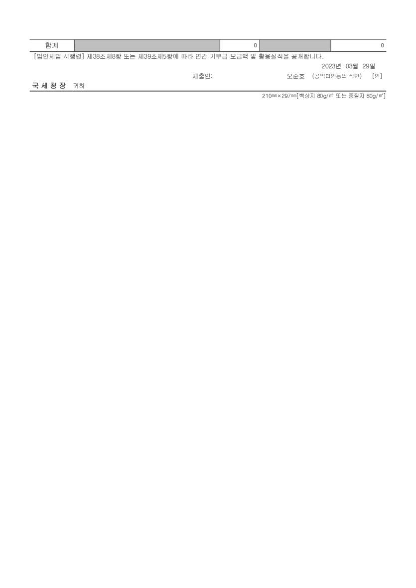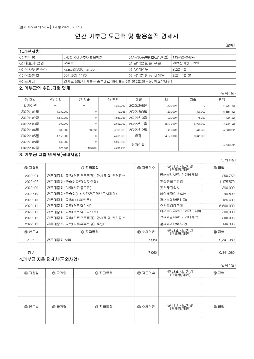 공익법인 2022년 기부금모금액 활용실적 및 결산서류 공시