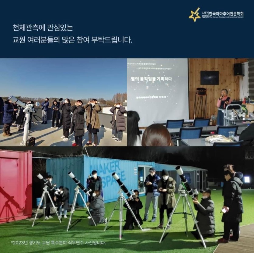 (사)한국아마추어천문학회에서는 전국 교원을 대상으로 한 특수분야 직무연수 프로그램인 '슬기로운 오늘의 천체관측'을 7월 29~31일 진행합니다.