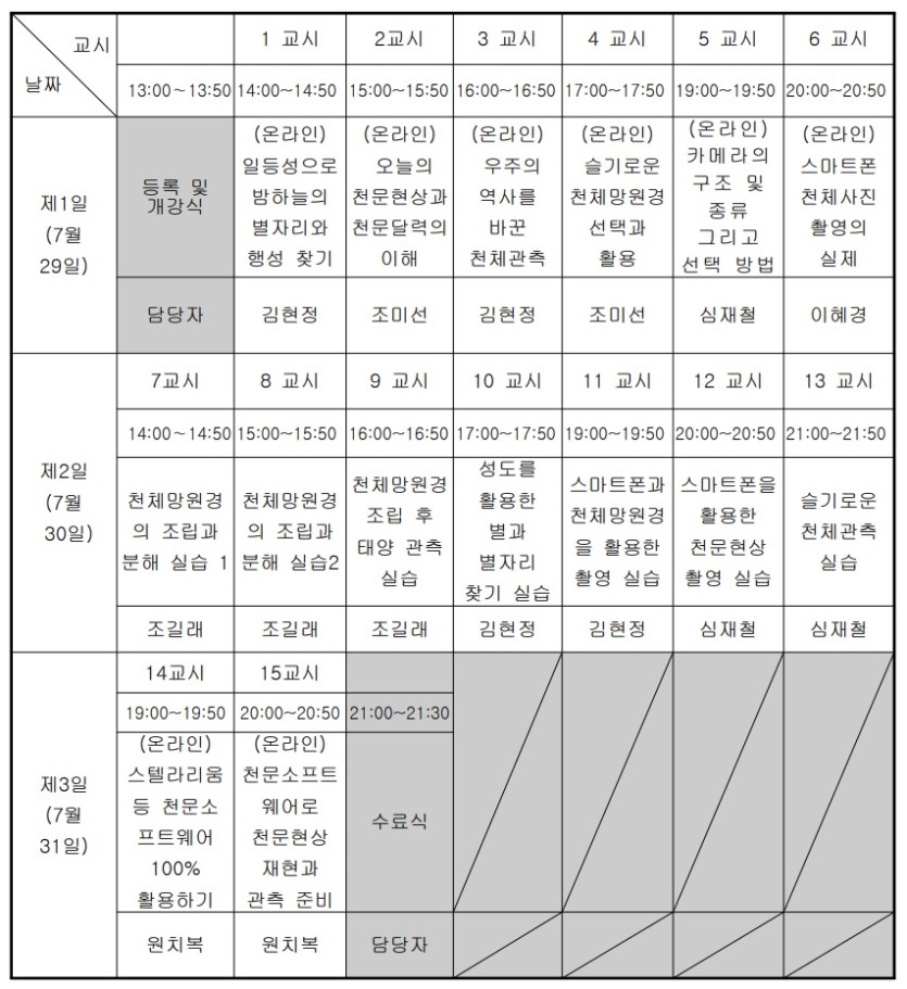 - 날짜: 7월 29일(온라인), 7월 30일(안성천문대 대면), 7월 31일(온라인)
