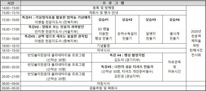 | 19:30 ~ 22:30 | 야외 실습 행사 1. 3D 펜을 이용한 행성 만들기 2. 레진 공예 3. 은하수 목걸이 만들기 4. 달뱃지 만들기 5. 별시계 만들기 | 자유관측 | |