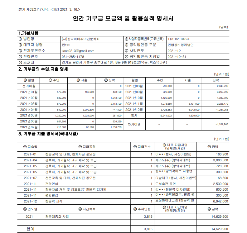공익법인 2021년 기부금모금액 활용실적 및 결산서류 공시 페이지 정보 작성자 관리자 쪽지보내기 메일보내기 자기소개 아이디로 검색 전체게시물 쪽지보내기 메일보내기 자기소개 아이디로 검색 전체게시물 댓글 0건 조회 5,676회 작성일 22-03-18 11:06 본문 (사)한국아마추어천문학회 2021년 공익법인 기부금 모금액 활용실적 및 결산서류를 아래와 같이 공시합니다.본 공시서류는 국세청 홈택스에서도 조회 가능함을 안내드립니다. 추천0 페이스북 공유 트위터 공유 구글+ 공유 목록 이전글 KAAS 천문우주 특강 안내(온라인 주소) 다음글 2022 천문지도사 연수 모집 연장 안내 댓글목록 댓글목록 등록된 댓글이 없습니다.